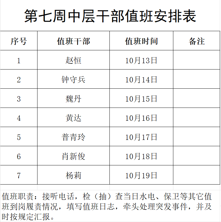 中层干部值班表(10月13日—10月19日)