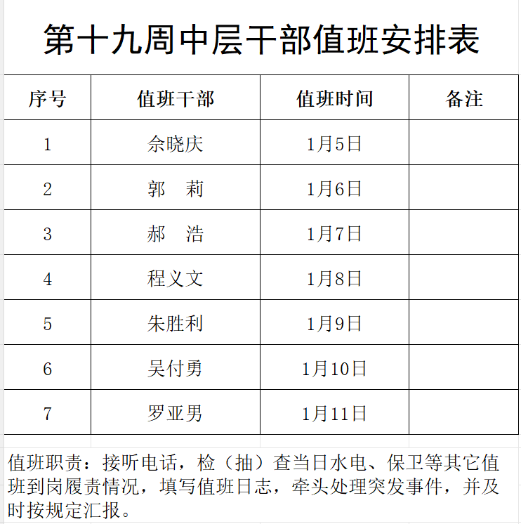 中层干部值班表(2026年1月5日—2026年1月11日)