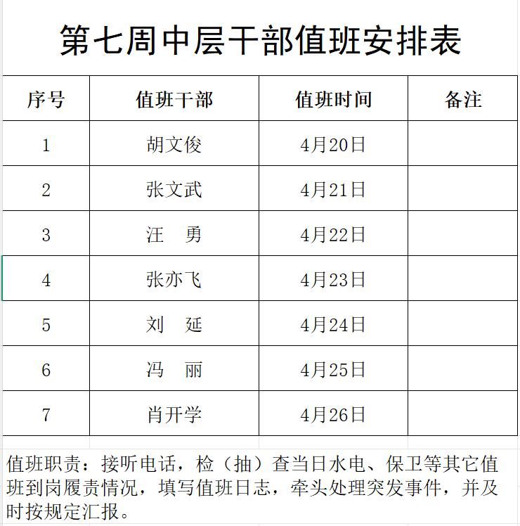 中层干部值班表(2026年4月20日—2026年4月26日)